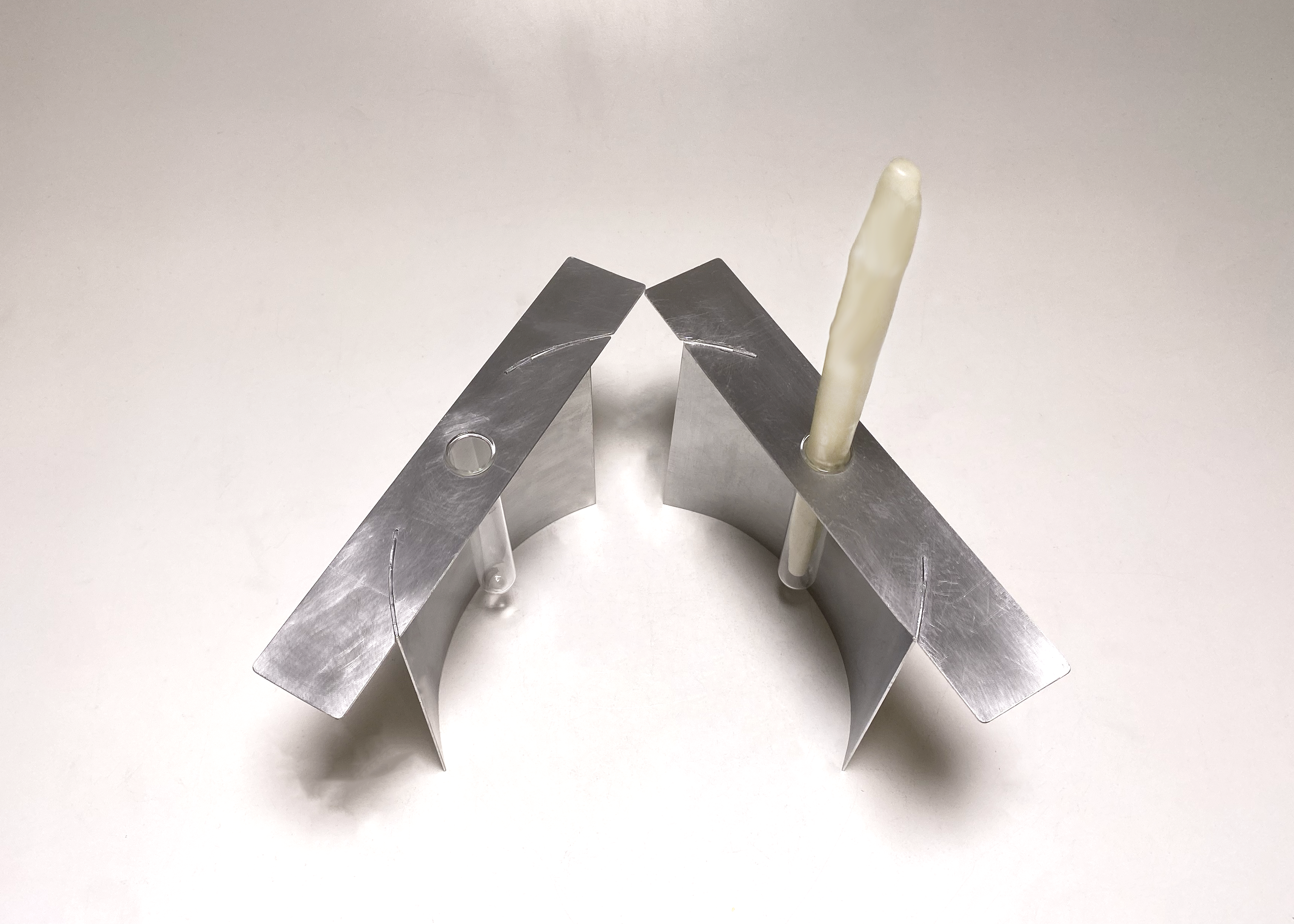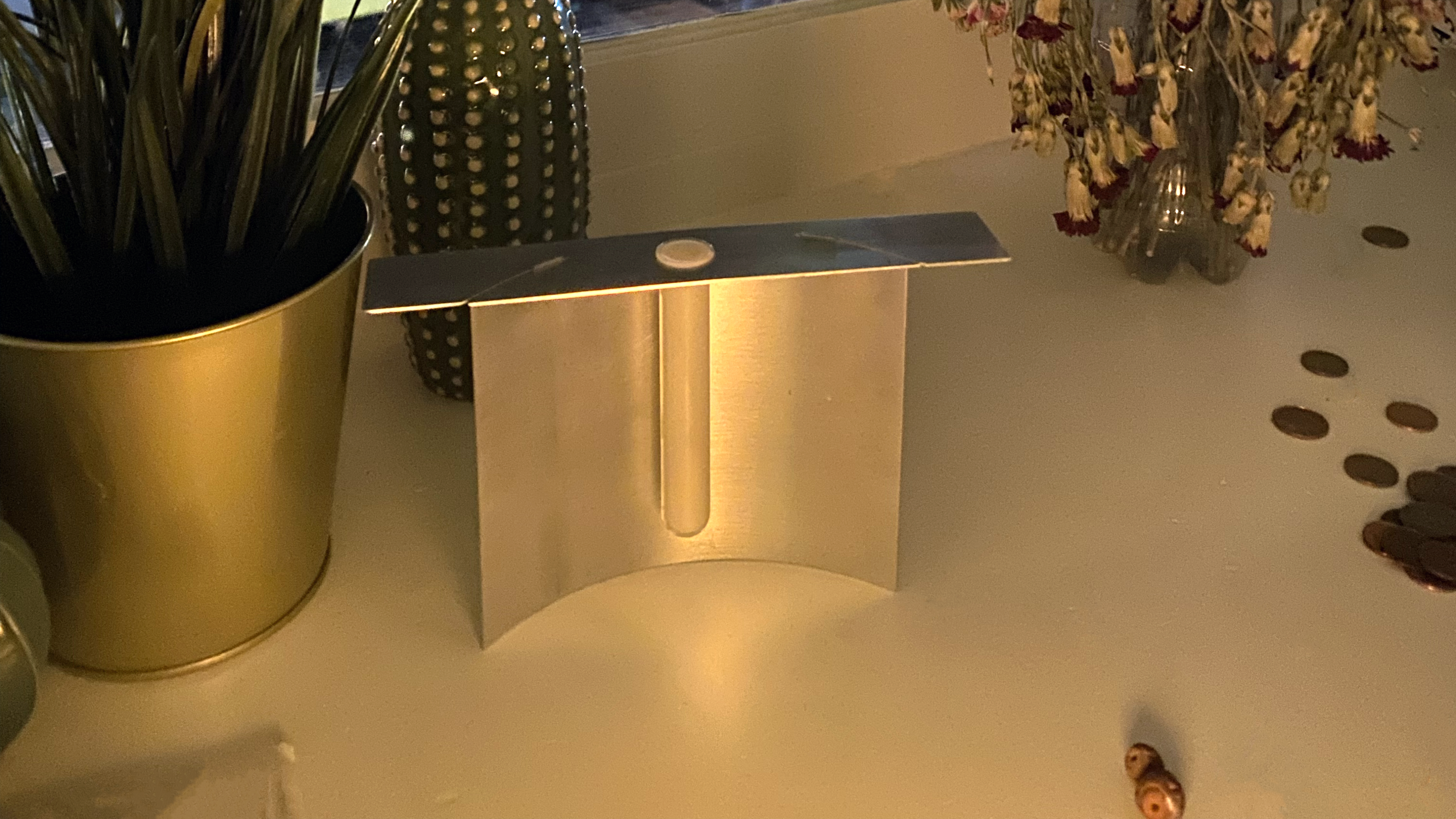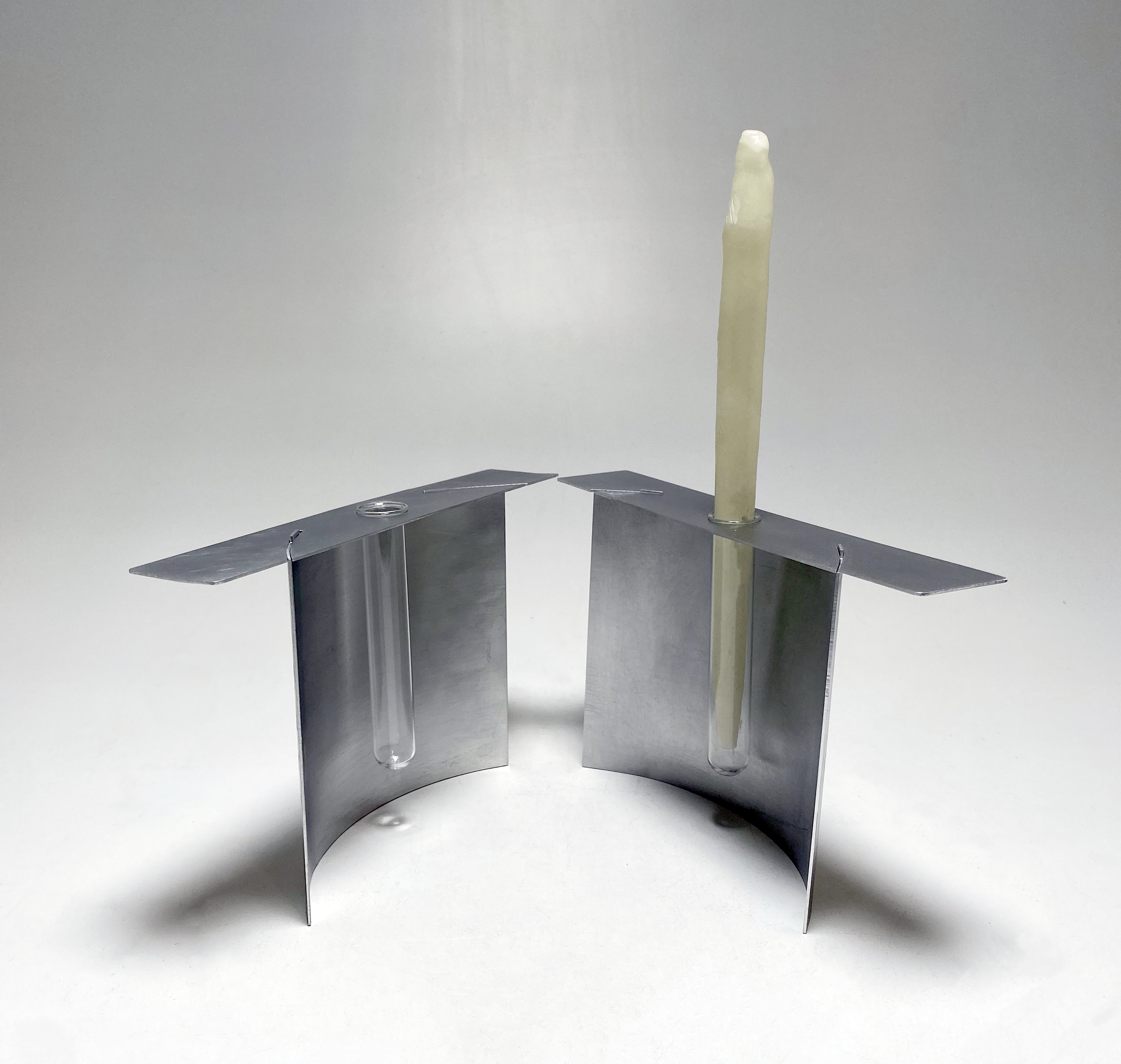 Crafted with precision within a balanced framework that harmonizes aesthetics and functionality, this candle holder duo is a playful exercise in making a ‘real’ product while allowing a lot of freedom. The merging of glass and aluminum yields a streamlined shape with clean lines that intersect through a simple notch system. The gently curved metallic surface reflects the gentle glow of candlelight, enhancing the ambiance of any space. Available in two versions—a standing model and a wall-mounted option—this piece adds an enchanting touch to your surroundings.