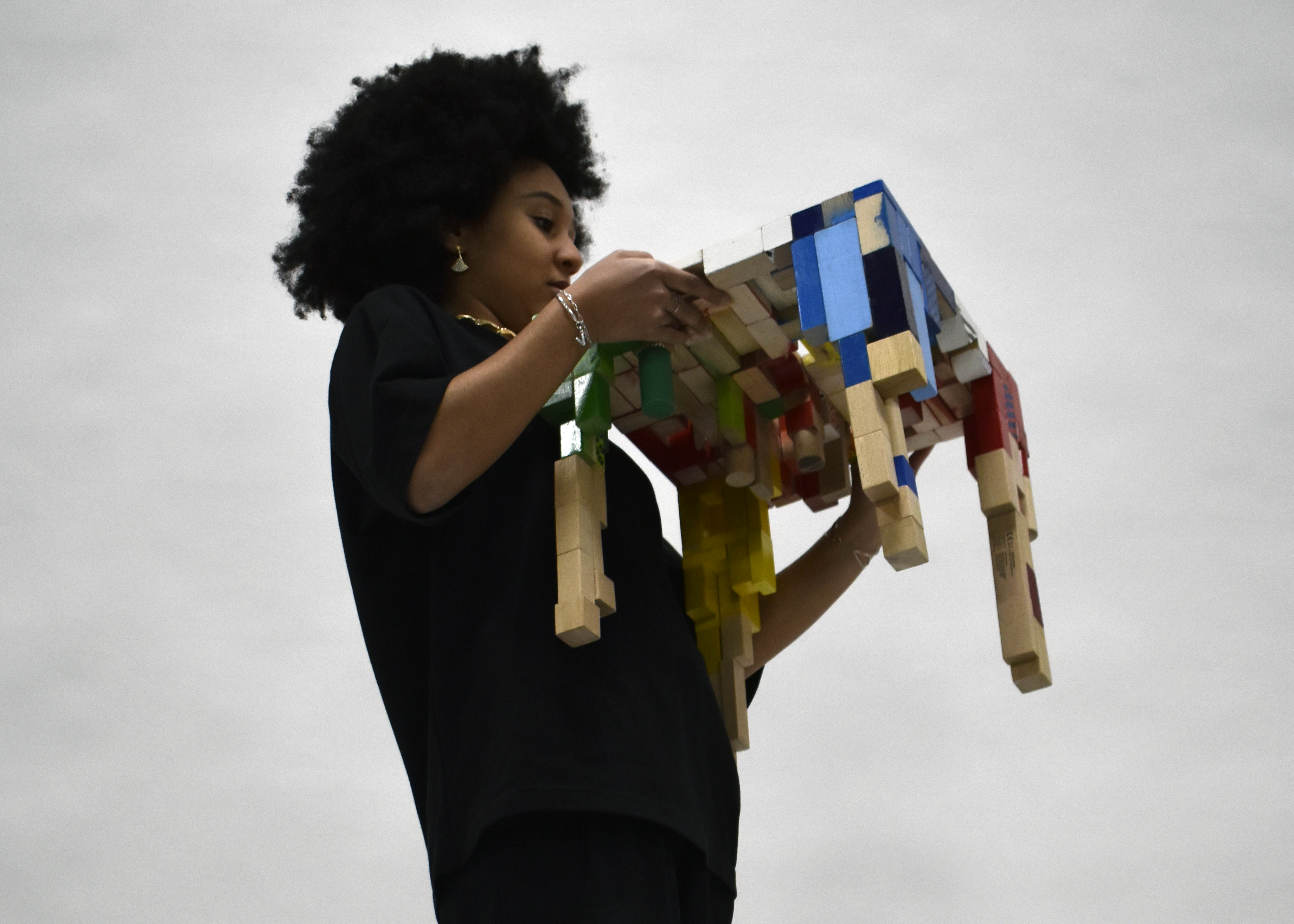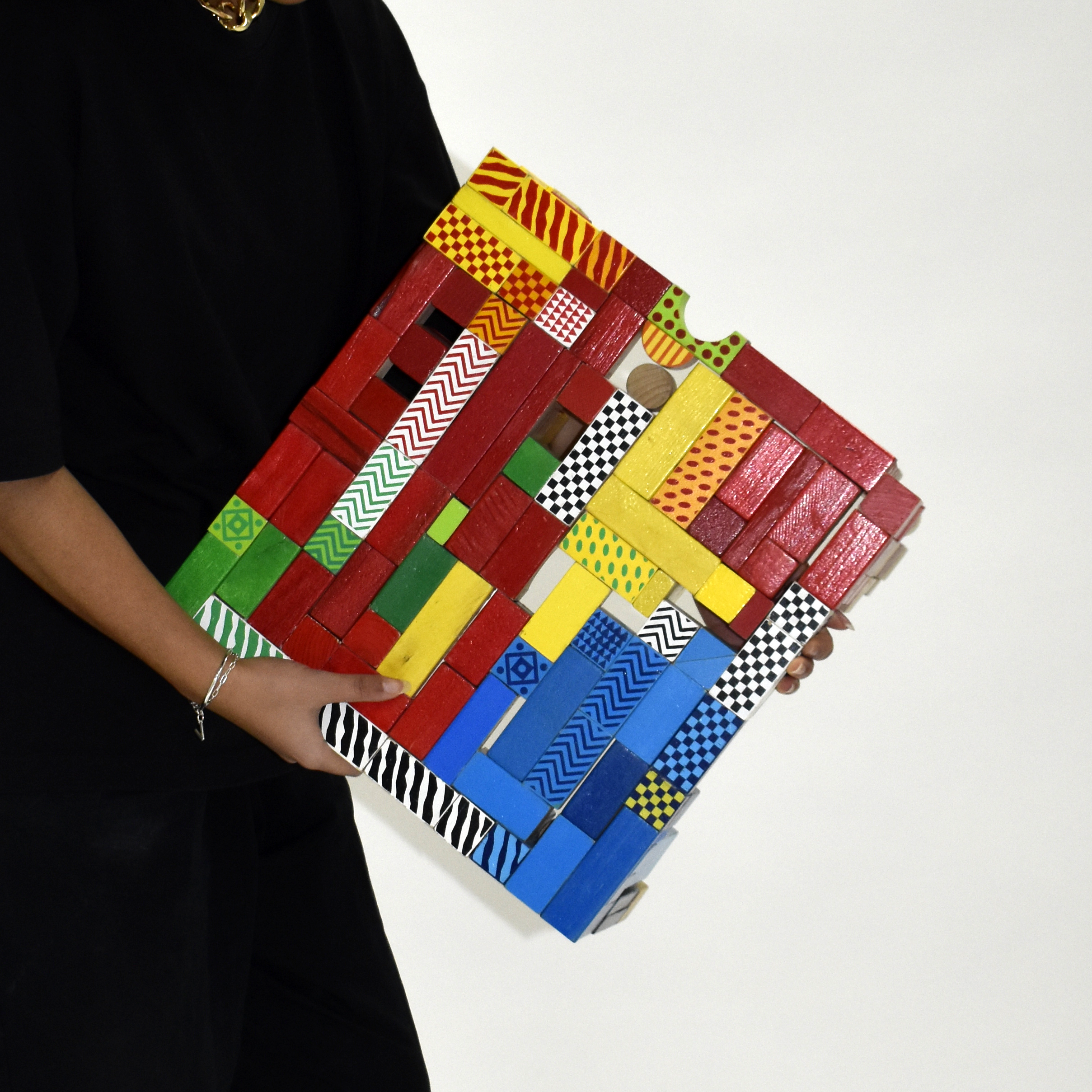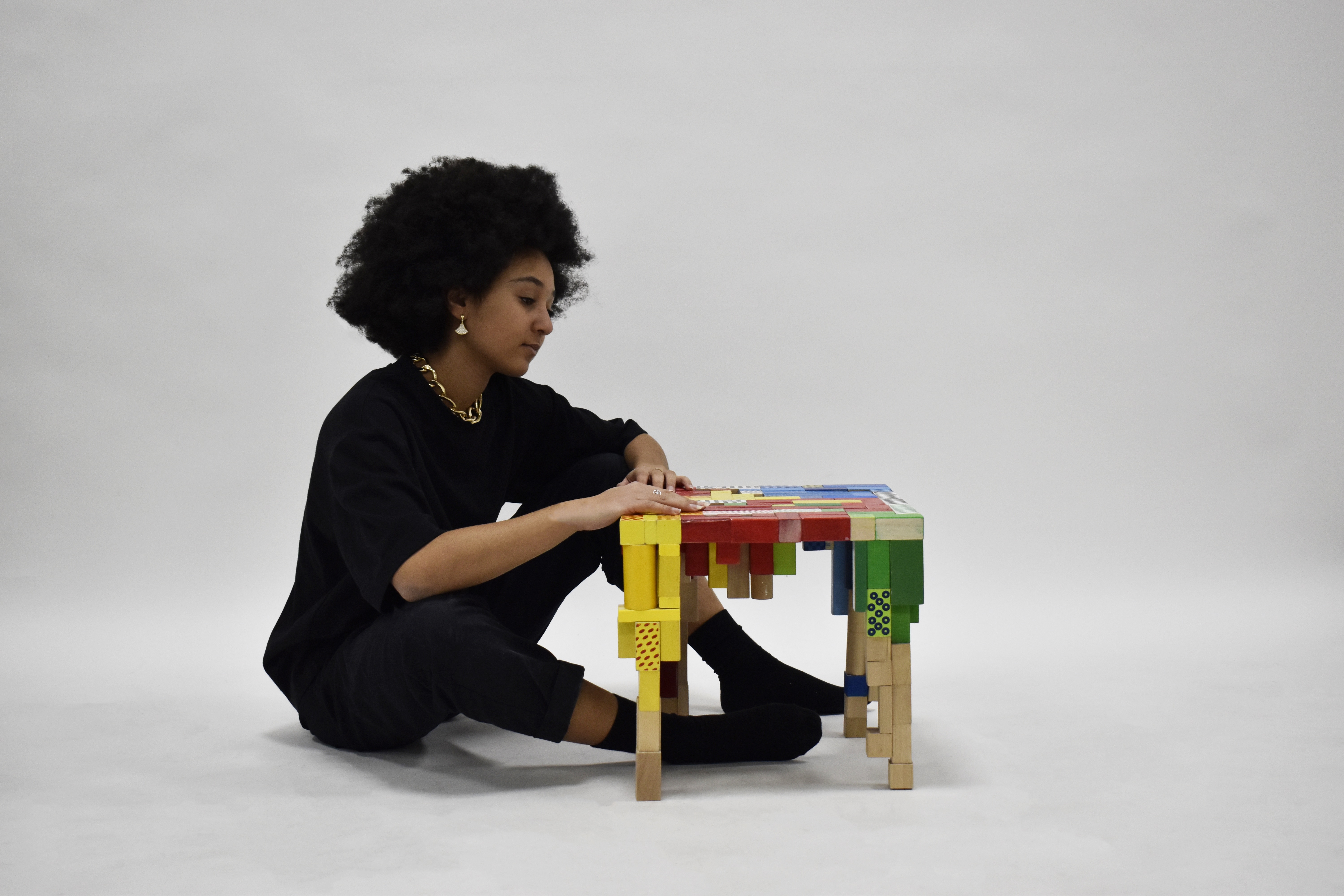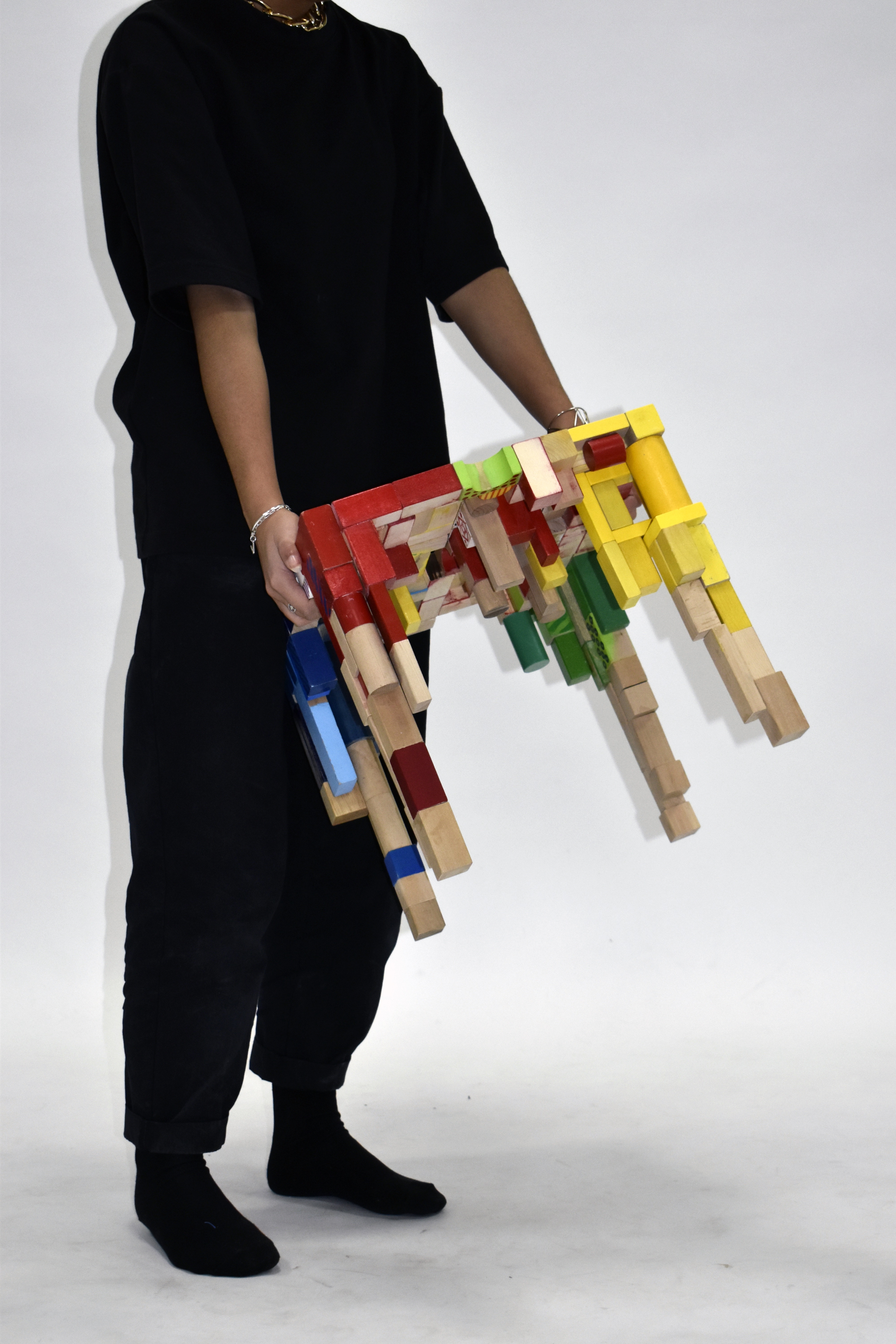 Crafted meticulously with wooden blocks, this toy block table boasts a sleek flat tabletop juxtaposed with an icicle-like structural motif that gracefully extends into its legs. Leveraging the inherent colours and patterns already ingrained within the blocks, a spirited amalgamation is orchestrated. This artistic vision seamlessly extends into the table's legs, where an intentional gradient emerges: as proximity to the ground increases, the design transitions to incorporate more exposed, natural wooden blocks, creating a visual continuum and inviting individuals to sit on the floor, serving as an adult-friendly playing surface or fostering leisurely conversations over a shared cup of tea.