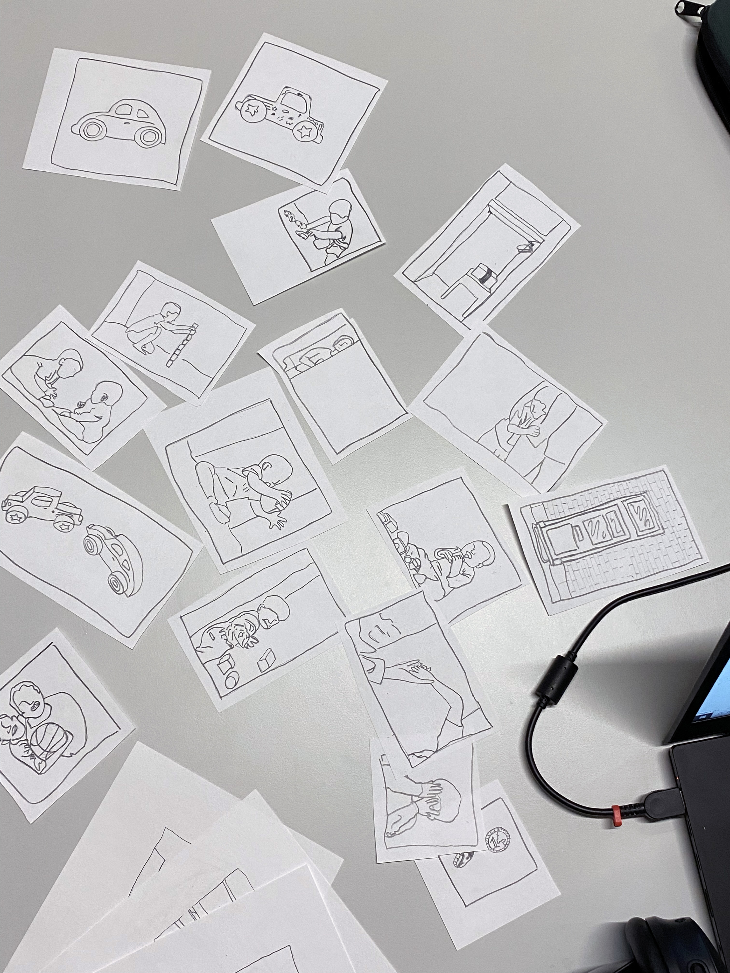 The table was accompanied in presentation by envelopes containing illustrated retellings of the interviews conducted during the collection of blocs, seconhand toys from the trading platfom Marktplaats.