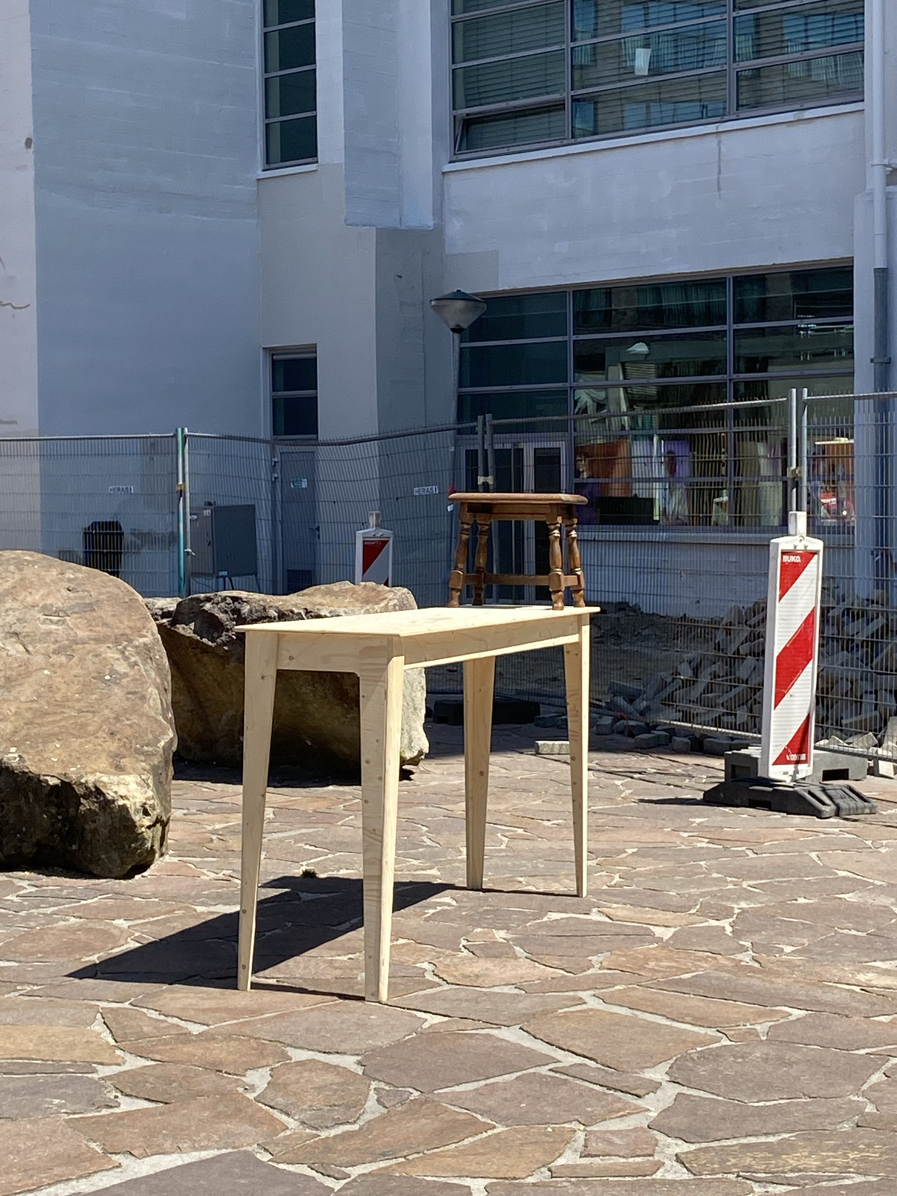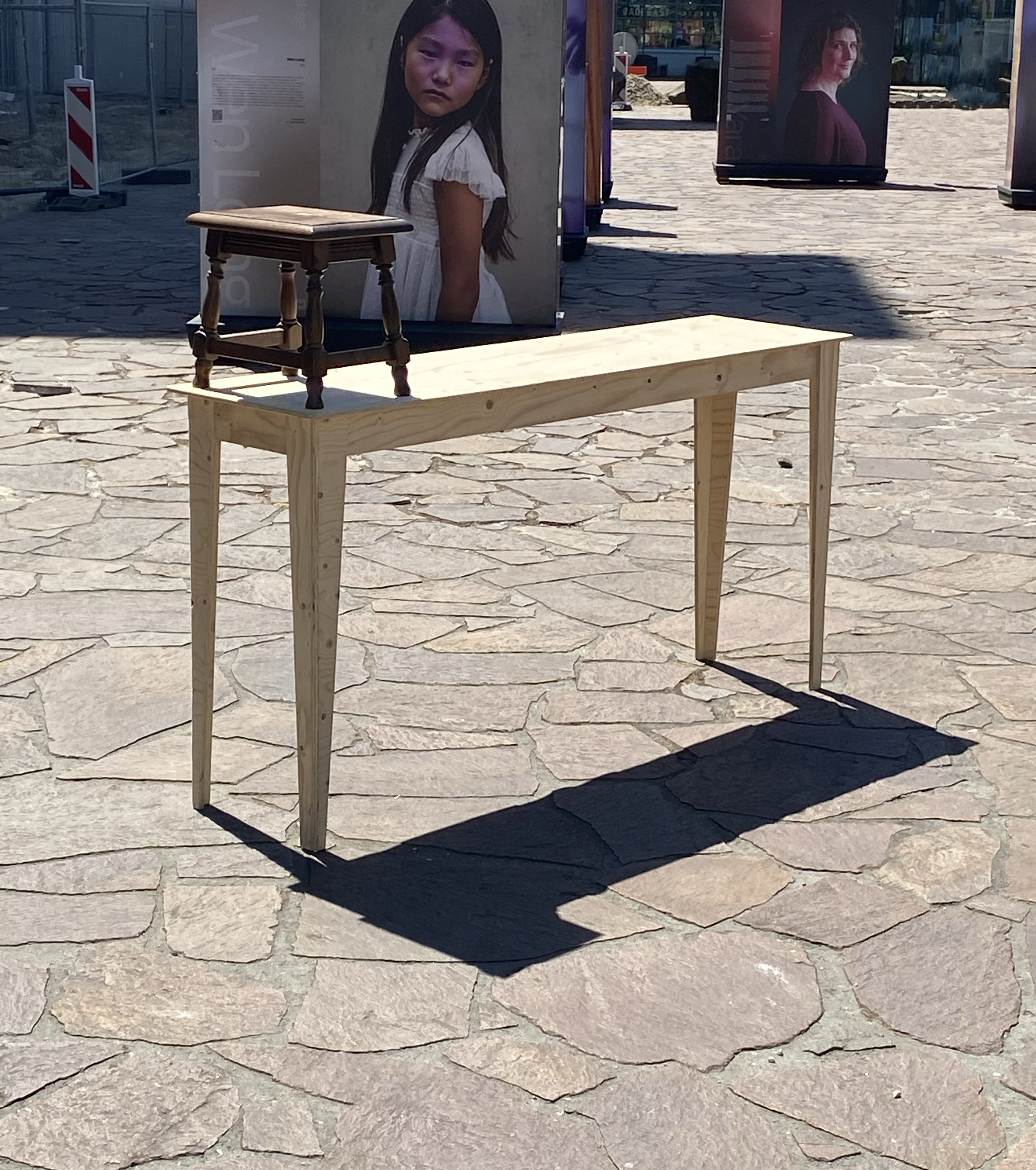 A wooden workbench, characterized by its sleek and tall design. A distinctive touch comes from repurposing an antique stool as a top shelf, blending historical charm with contemporary utility. This integration of past and present not only catches the eye but also enhances the work process, as accompanying the workbench is a two-layer chair, offering both comfort and practicality.
